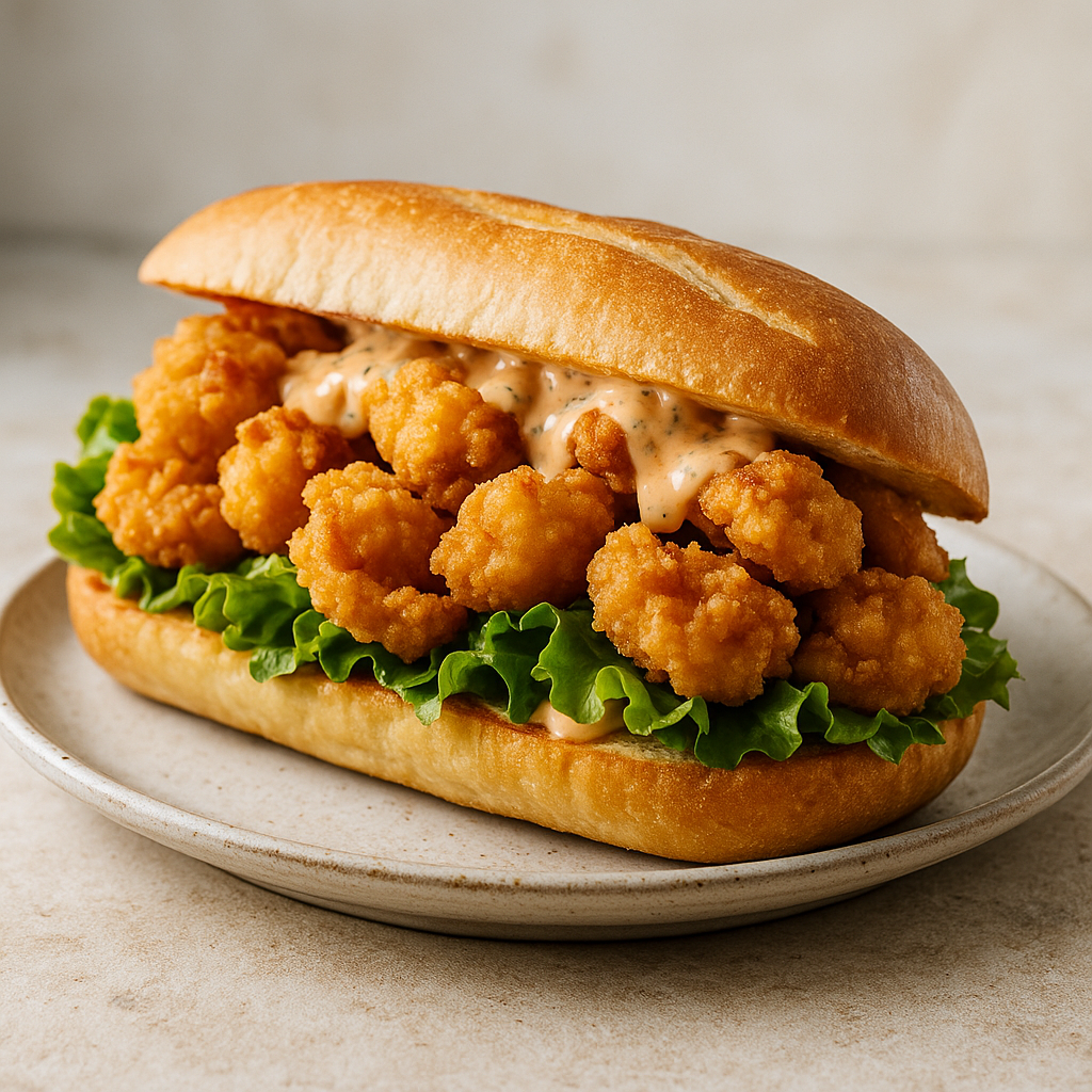 A classic New Orleans sandwich, featuring crispy fried shrimp nestled in a soft baguette, layered with fresh lettuc
