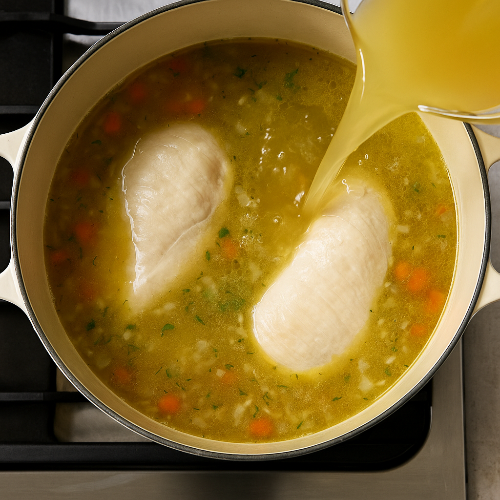 Add the chicken breasts to the pot and pour in the chicken broth.