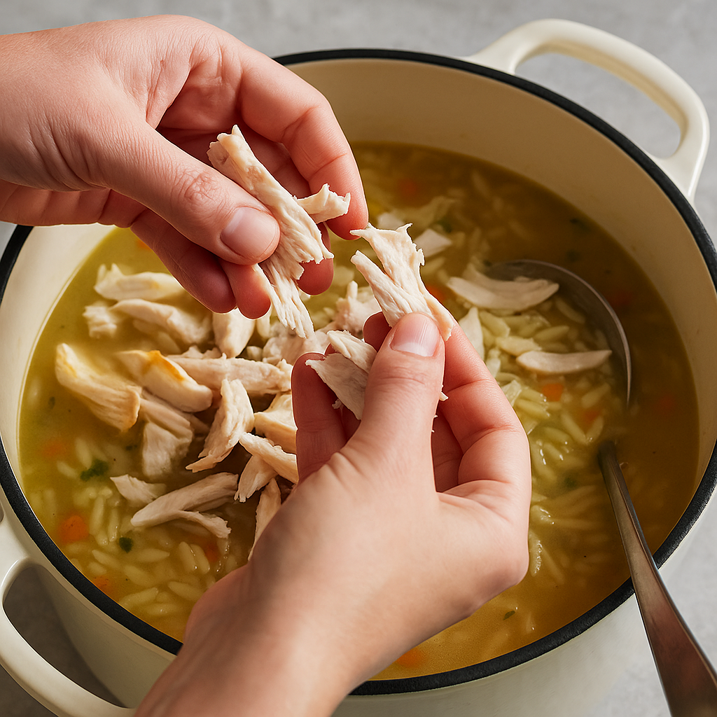 While the orzo is cooking, shred the chicken into bite-sized pieces.